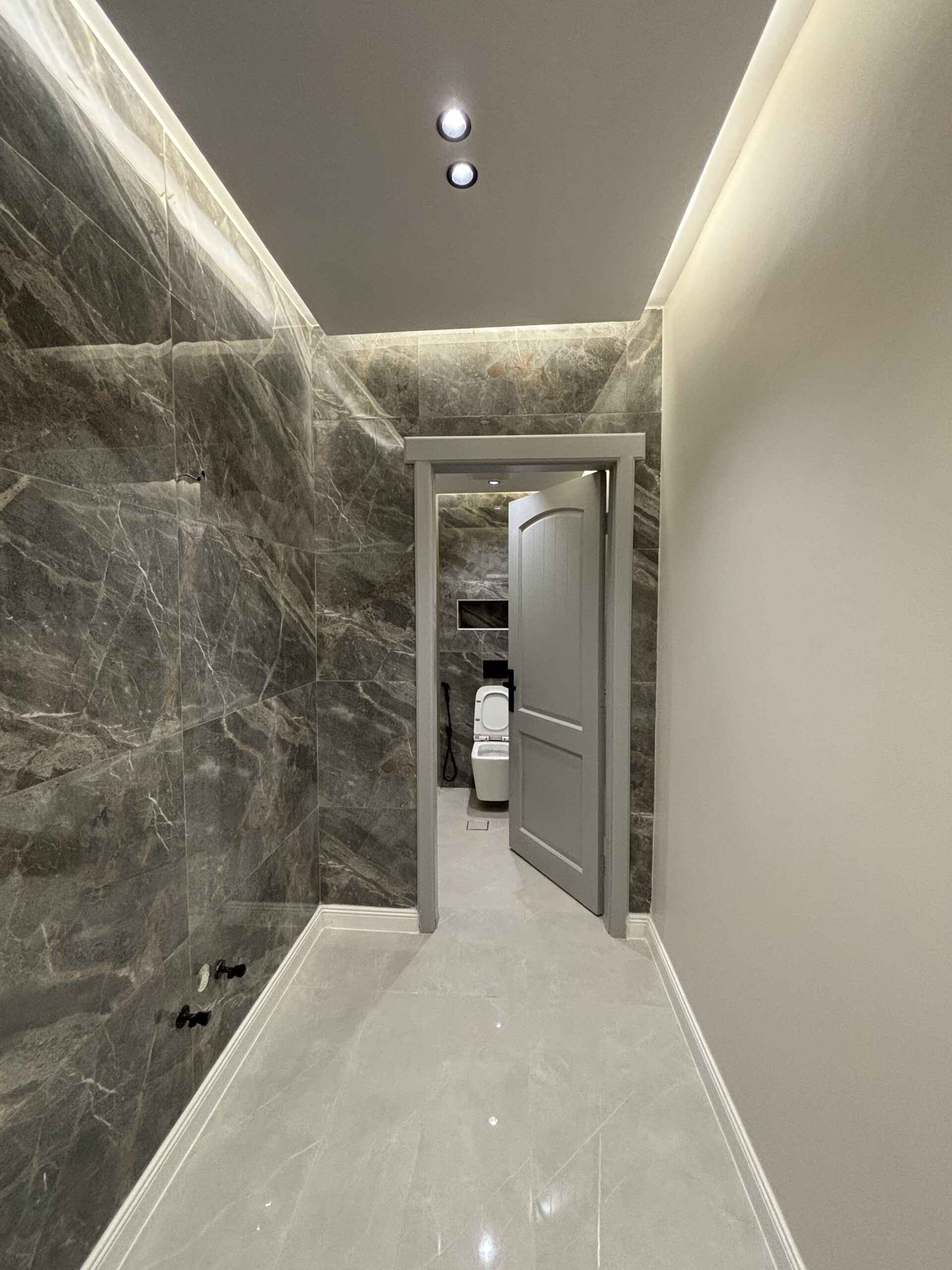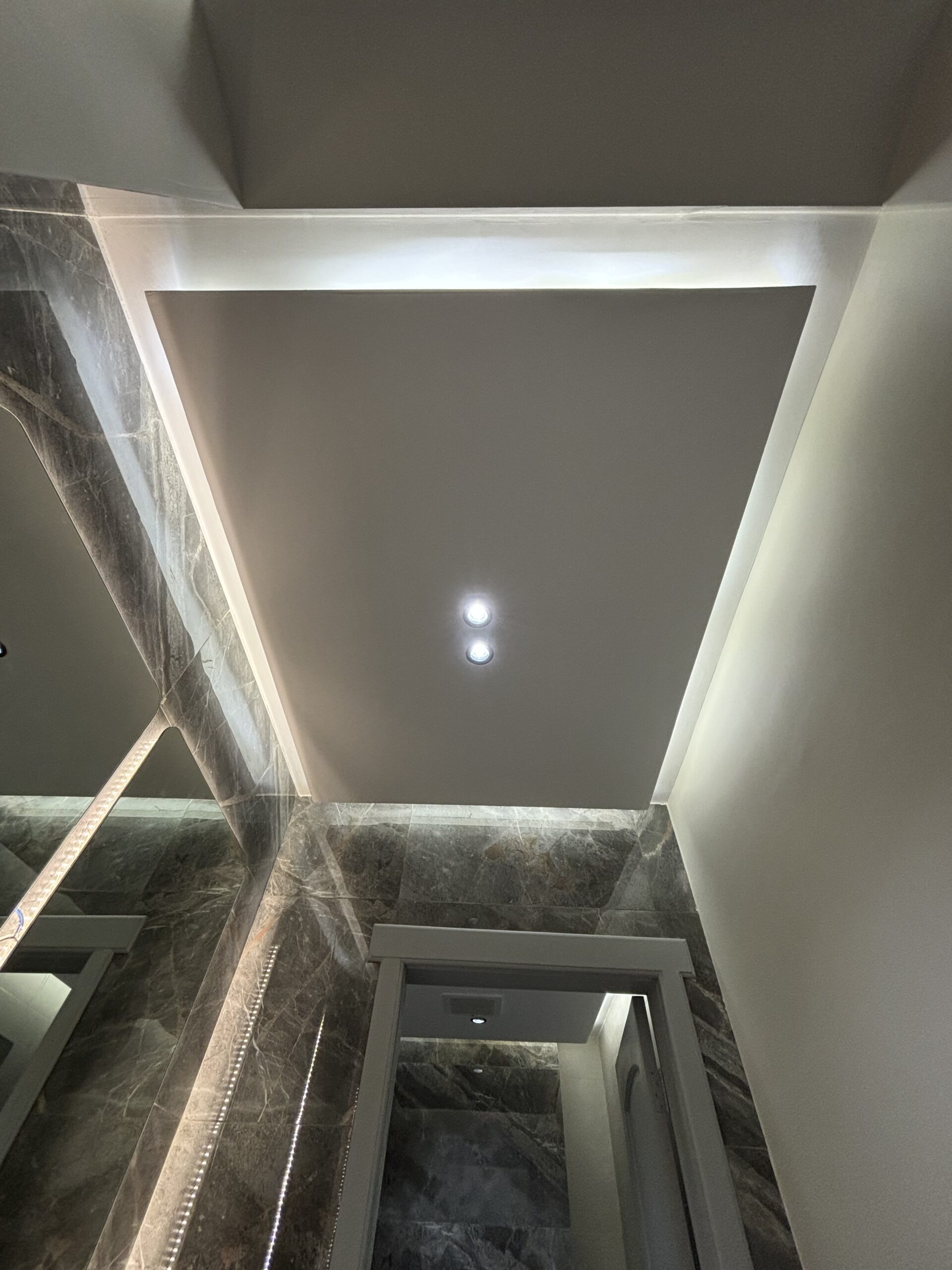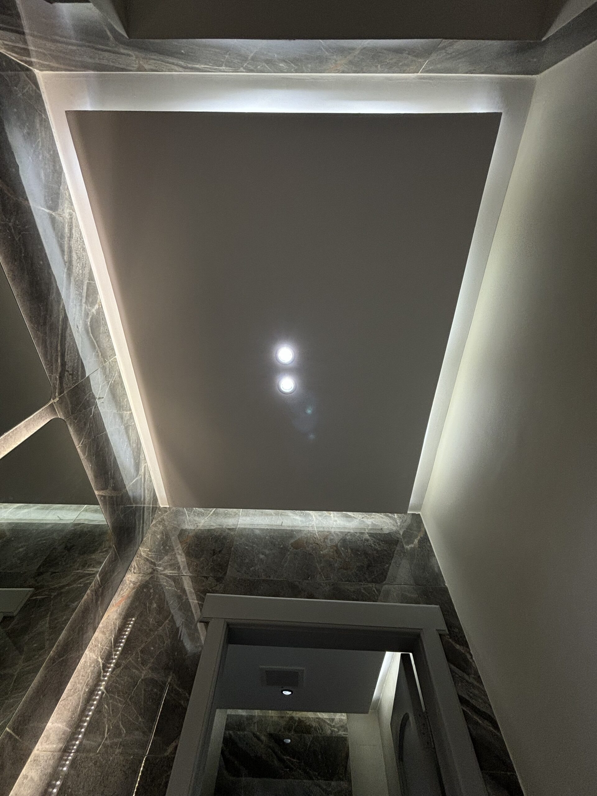 التشطيب الفاخر (لوكس): يستخدم مواد عالية الجودة وتصاميم مميزة (مثل: رخام طبيعي، بورسلان فاخر، دهانات فاخرة مقاومة للعفن، أنظمة إضاءة ذكية، أطقم صحية فاخرة، وتفاصيل دقيقة مثل الكورنيش والأسقم المعلقة المعقدة). التركيز هنا على الرفاهية والمتانة والتصميم الفريد.